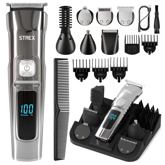 De 14-in-1 trimmer van Strex is te gebruiken als baardtrimmer, neustrimmer, scheerapparaat en tondeuse. De ruime hoeveelheid kammen en koppen vonden we handig, net als het waterdichte design. Het ledschermpje is makkelijk afleesbaar en gebruiksvriendelijk.
