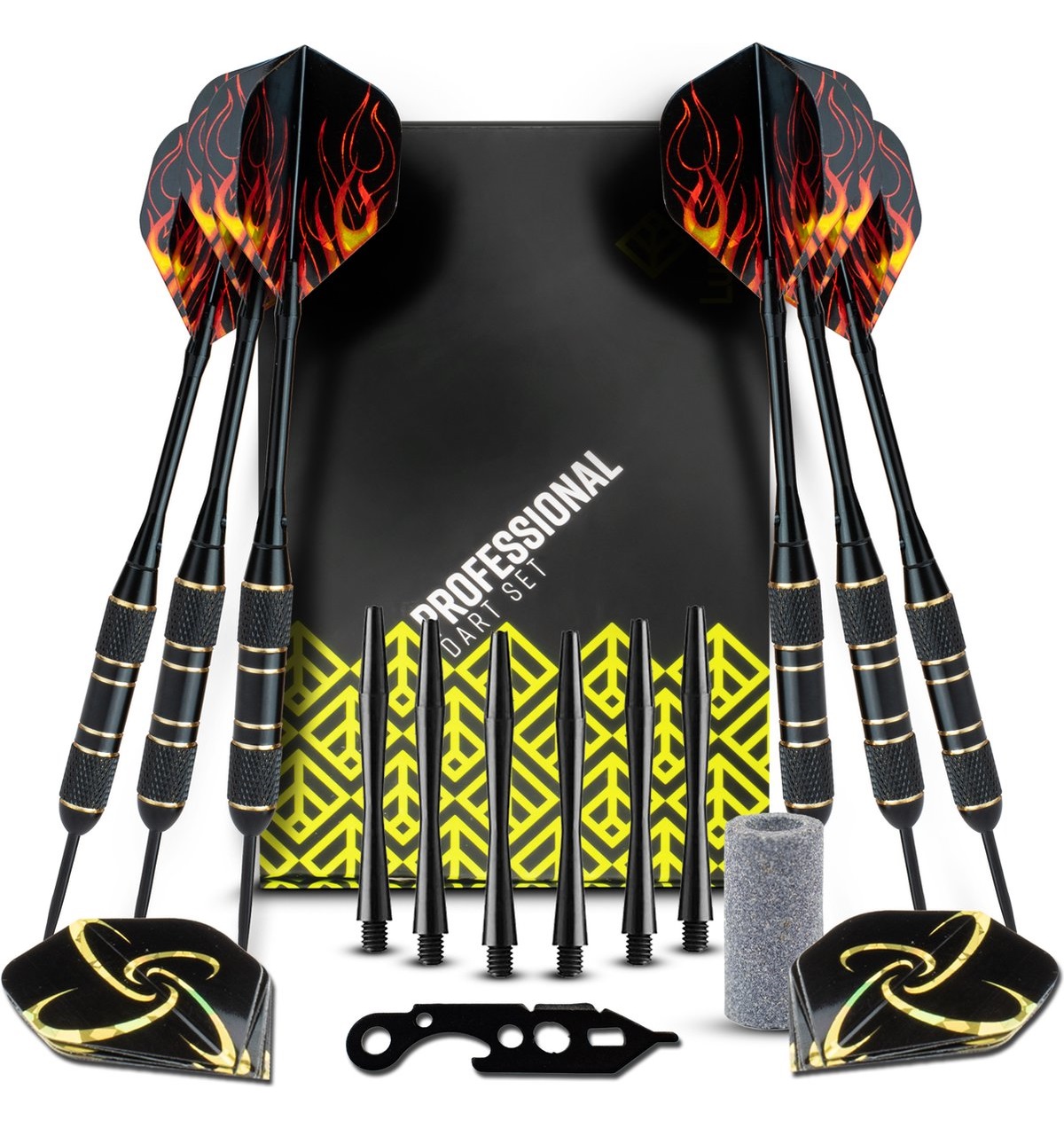 • Mooie set met diverse toebehoren zoals flights en een slijpsteen voor het scherp houden van de steeltips