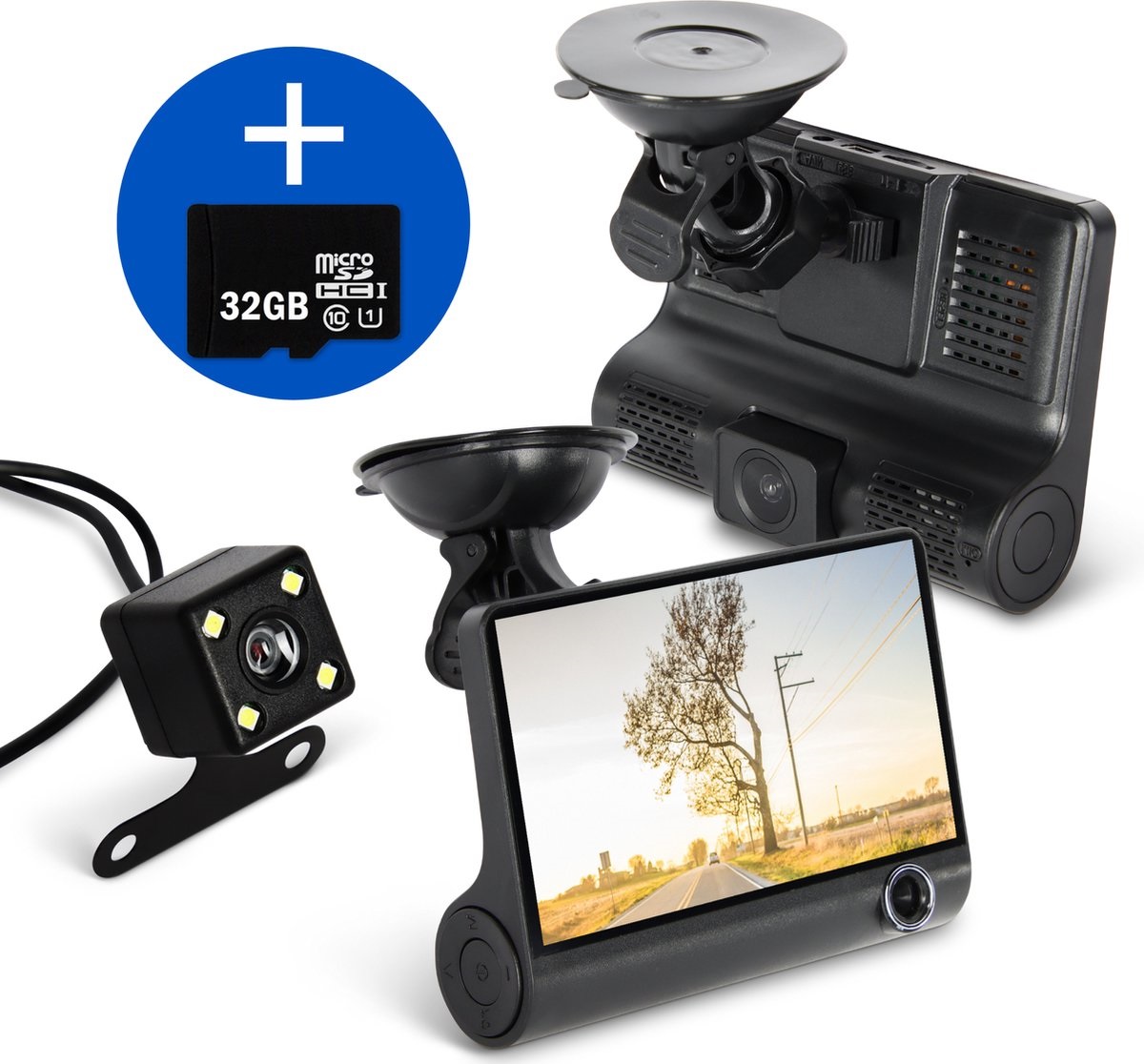 Deze dashcam auto is een geavanceerde full HD-camera die zowel de weg voor je als achter je én de binnenkant van je auto vastlegt. Hierdoor weet je zeker dat ieder belangrijk detail vastgelegd wordt, wat handig is bij een mogelijk ongeval.
