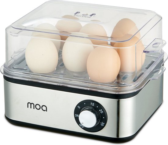 Deze eierkoker van MOA biedt ruimte voor maar liefst acht eieren tegelijkertijd. We vonden het handig dat dit model over een timer beschikt en met maatbeker geleverd wordt. Ook handig: de tray voor het pocheren van een ei.