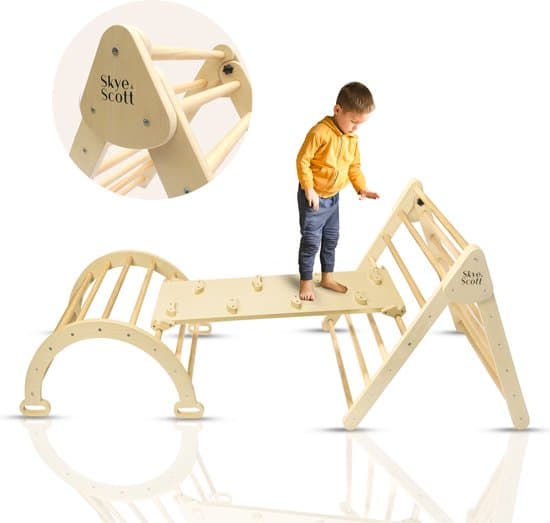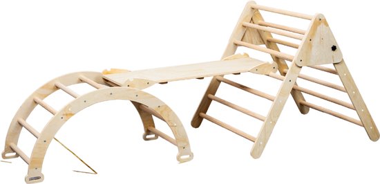 Dit klimtoestel is gemaakt van hoogwaardig natuurlijk hout. De set bestaat uit een klimboog, een helling met glijbaan en een opvouwbare driehoek. Deze 3 onderdelen kan je op veel manieren samen gebruiken.