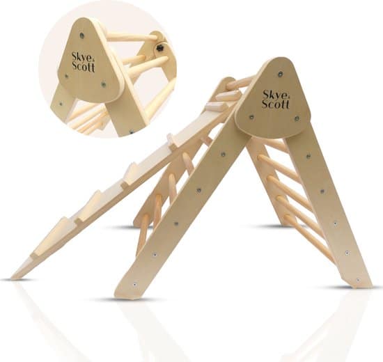 De klimdriekhoek van Skye & Scott is een echte favoriet, gemaakt van hoogwaardig berkenmultiplex zonder splinters of scherpe randjes. Dit model is ideaal om op te klimmen en wordt geleverd met een glijd- en klauterplank, die erg in de smaak viel. Het rek is eenvoudig in te klappen.