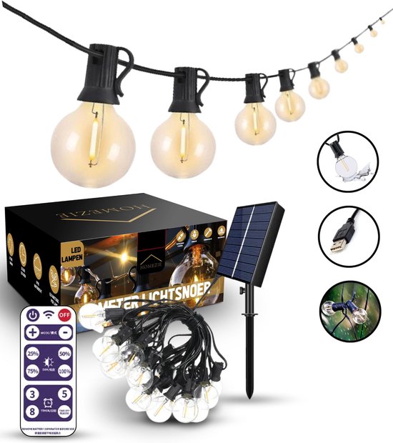 Het Homezie lichtsnoer is een luxueuze keuze als het gaat om tuinverlichting. Deze lichtslinger, voorzien van waterdichte led-lampjes, heeft een koppelbaar uiteinde en dimbaar warm wit licht. Het snoer is 15 meter lang en heeft 25 duurzame plastic led-lampjes, die eruitzien als echt glas. Met dit model creëer je de perfecte sfeer in jouw buitenruimte.