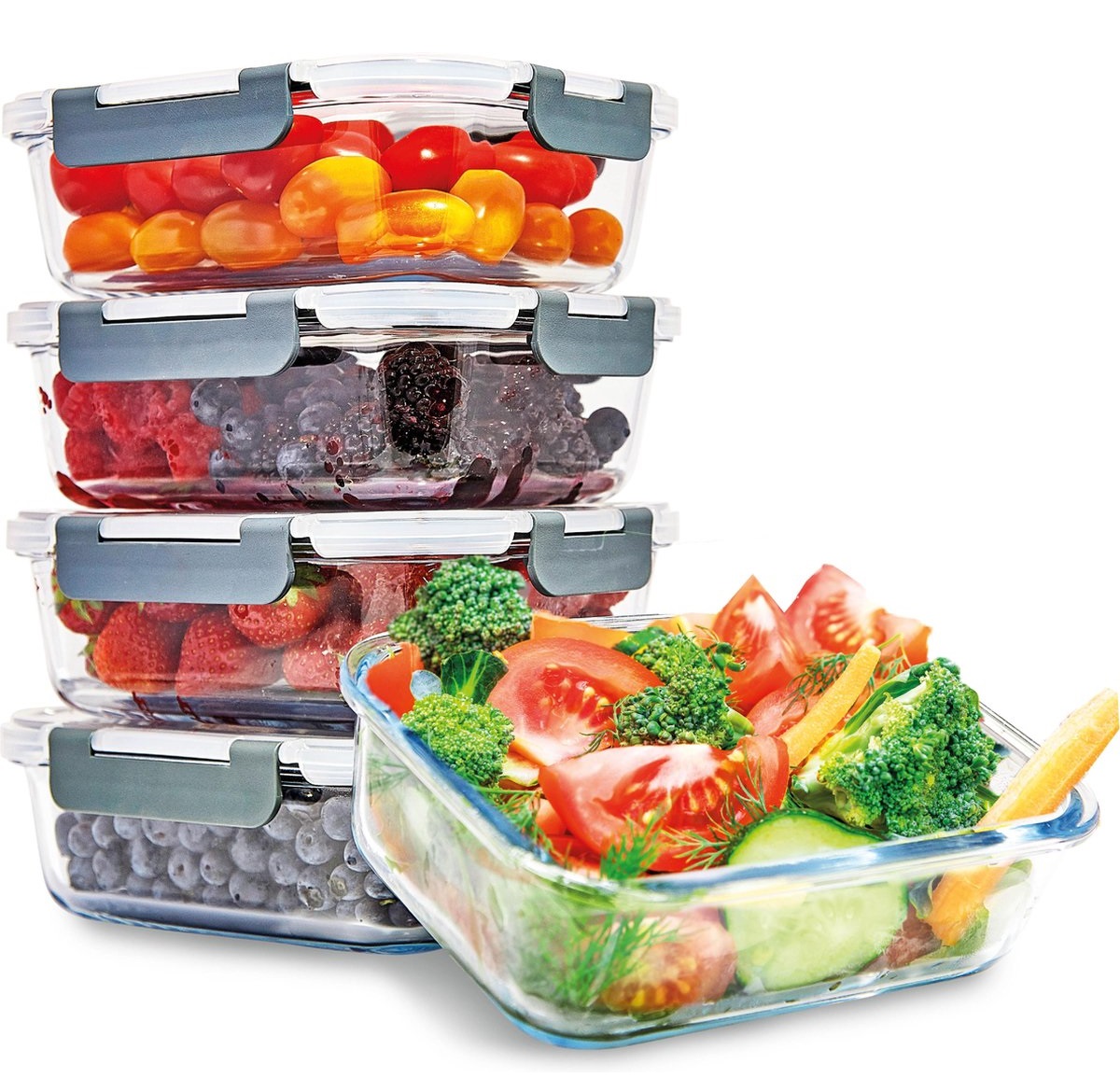 Deze set bestaat uit 5 glazen bakjes met bijpassende deksels. Ze zijn lekvrij, luchtdicht en waterdicht, waardoor je eten extra lang vers blijft.