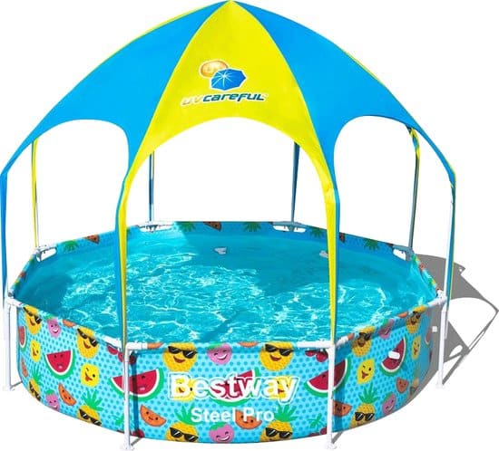 Op zoek naar een badje voor je kinderen? Dit ronde zwembad met een doorsnede van 244 centimeter is groot genoeg voor meerdere kleine kinderen én zelfs om af en toe als volwassene in af te koelen. In vergelijking met andere kinderbadjes heeft dit opzetzwembad een groot pluspunt: een zonnescherm. Waterpret is heel erg leuk in de zomer, maar de zon kan best gevaarlijk zijn. Daarom is zonnebrand ook altijd belangrijk. Met het zonnescherm zijn jij en je kinderen goed beschermd tegen de kracht en de hitte van de zon.