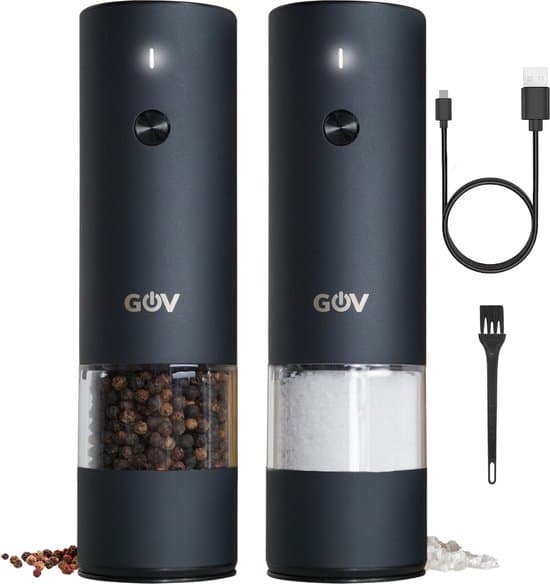 Dit luxe peper-en-zoutstel van GOV is elektrisch en oplaadbaar, waardoor je geen gedoe met batterijen hebben. De maalgraad is aanpasbaar in vijf standen en je bedient het apparaatje met één druk op de knop. De ingebouwde belichting is een leuke extra.