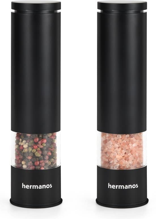 Deze set van Hermanos bestaat uit een elektrische pepermolen en zoutmolen. De molens hebben een strakke, zwarte afwerking en beschikken over ingebouwde ledverlichting. Je past de maalgraad naar wens aan en bedient met één druk op de knop.