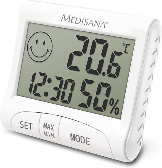 Deze digitale hygrometer van Medisana geeft de luchtvochtigheid en kamertemperatuur weer met een ruim bereik. Daarnaast wordt ook de tijd weergegeven en stel je een alarm in. We vonden dit model makkelijk te bevestigen en vriendelijk geprijsd.